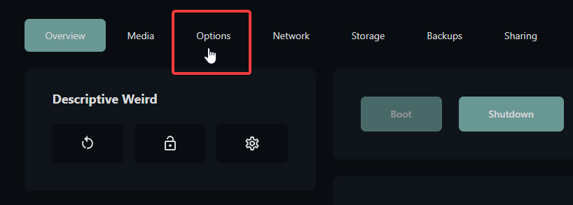 Within the server management interface, click the Options tab in the top navigation menu.