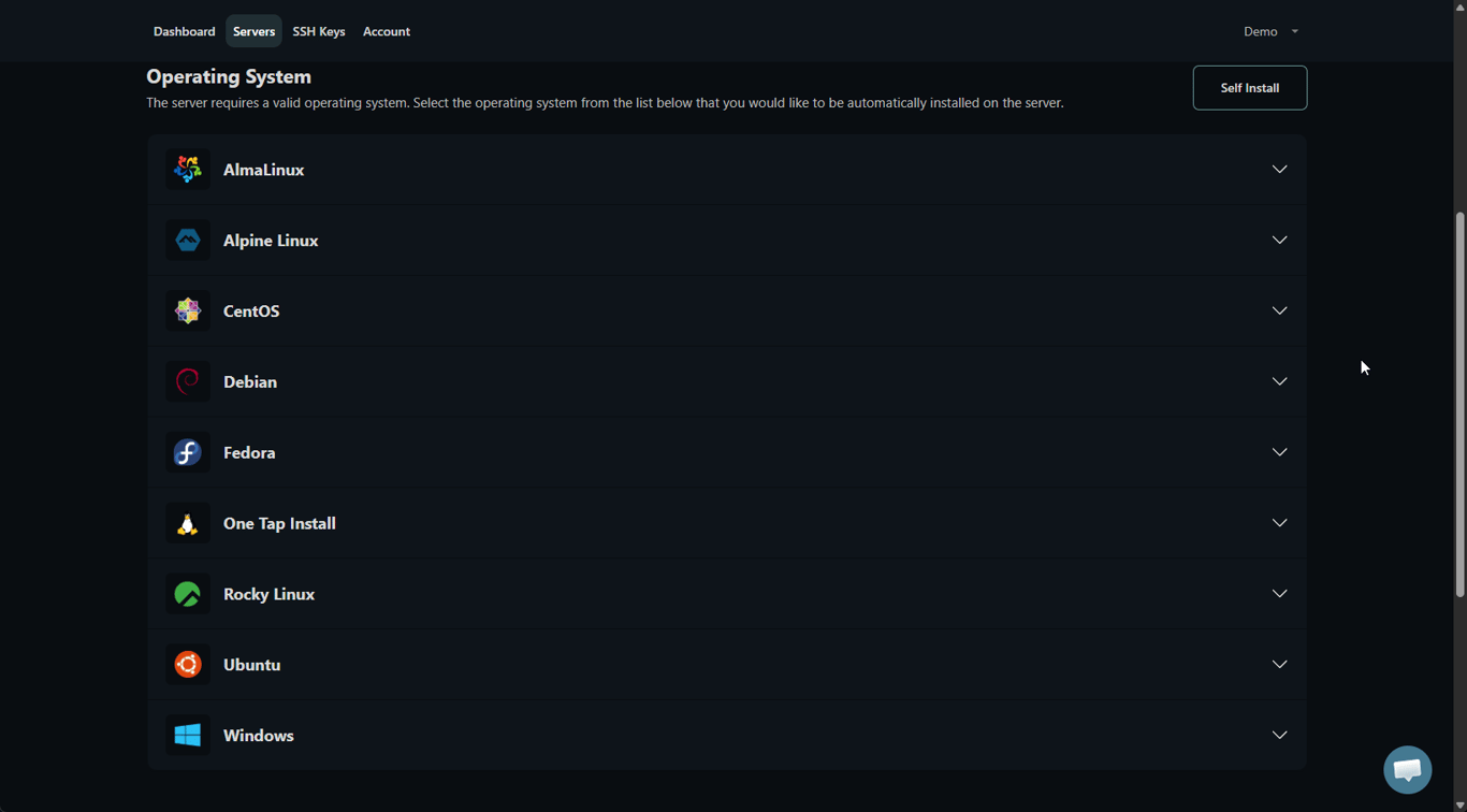 Scroll down to the Operating System list. You have several options including Linux distributions (AlmaLinux, Debian, Ubuntu, etc.) and Windows.