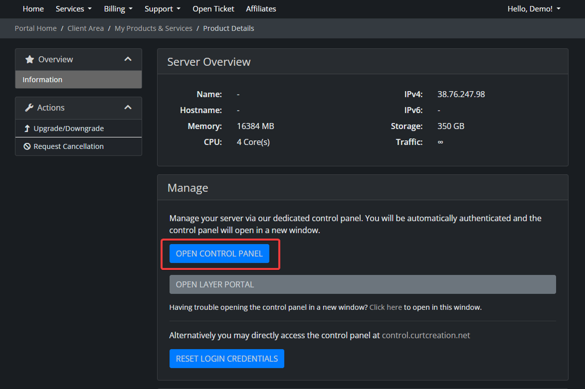 Click the blue OPEN CONTROL PANEL button. This will automatically authenticate you and open the server management interface in a new window.