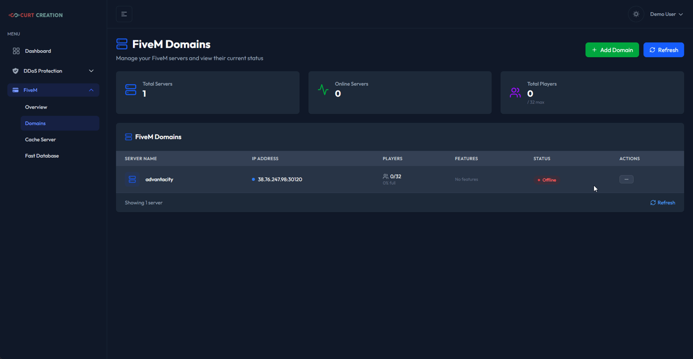 Your domain will now appear in the FiveM Domains list, where you can monitor its status and player count.